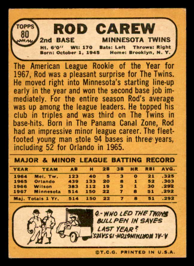 1968 Topps Baseball #080 Rod Carew Twins EX-MT 539234