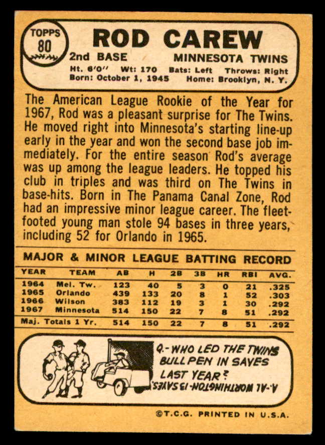 1968 Topps Baseball #080 Rod Carew Twins NR-MT 539232