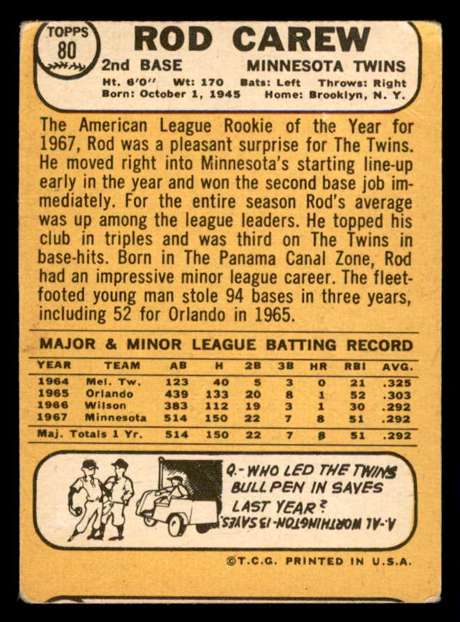 1968 Topps Baseball #080 Rod Carew Twins VG 541054
