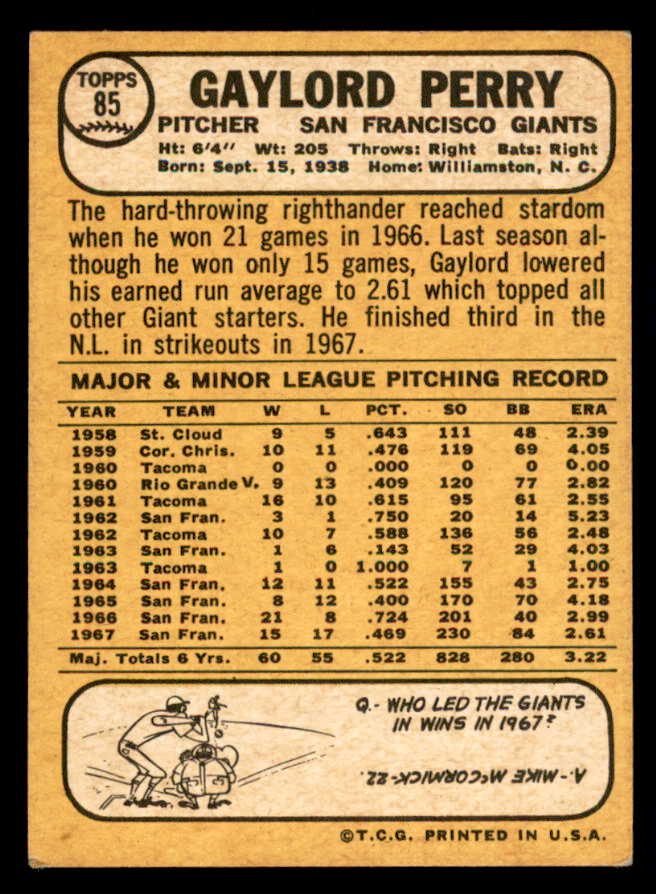 1968 Topps Baseball #085 Gaylord Perry Giants EX+/EX-MT 541025