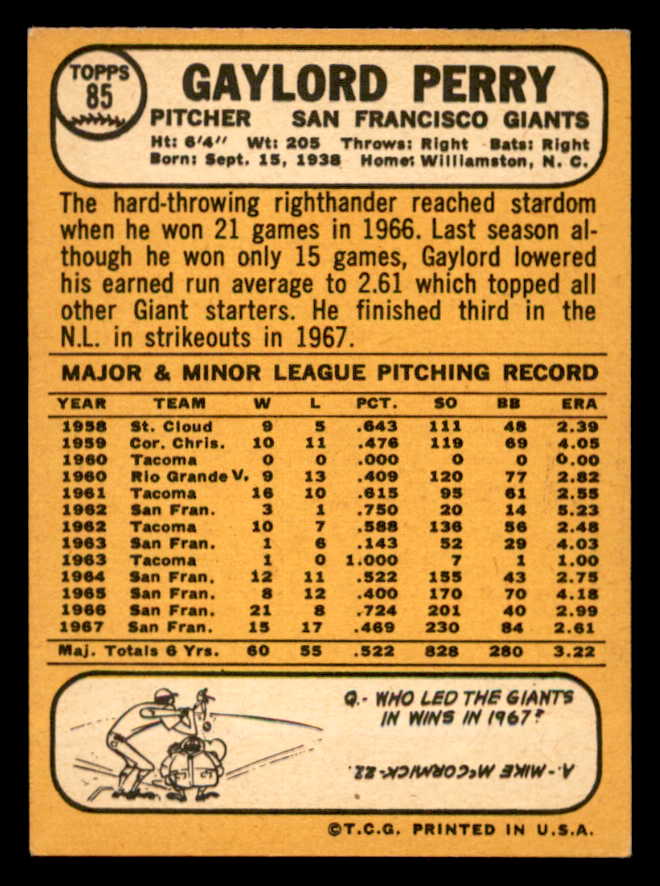1968 Topps Baseball #085 Gaylord Perry Giants EX-MT 538917