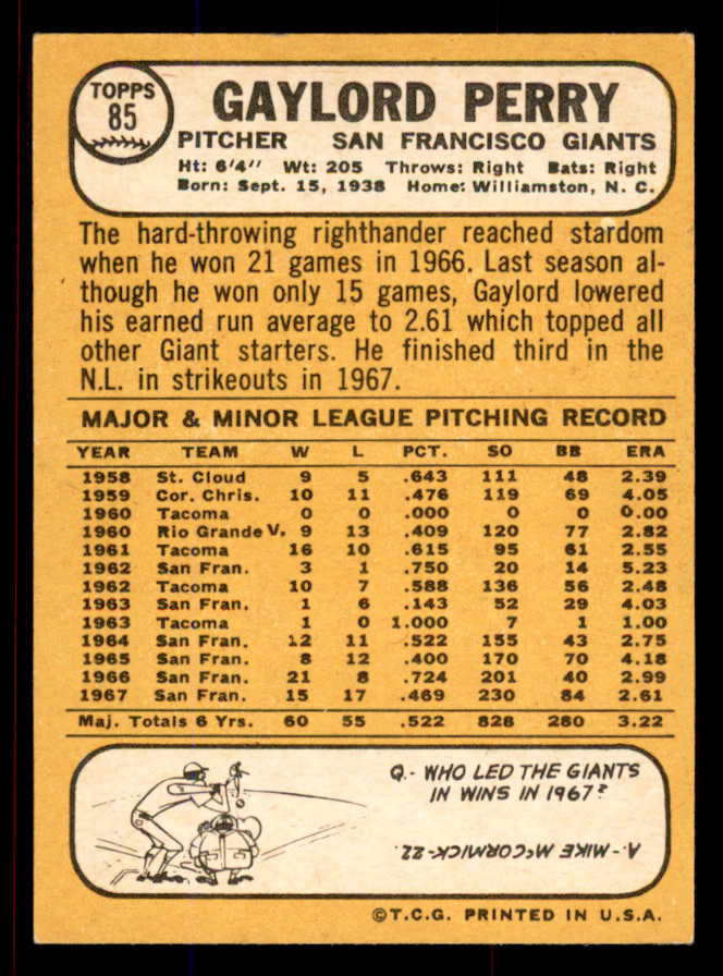 1968 Topps Baseball #085 Gaylord Perry Giants NR-MT 545436