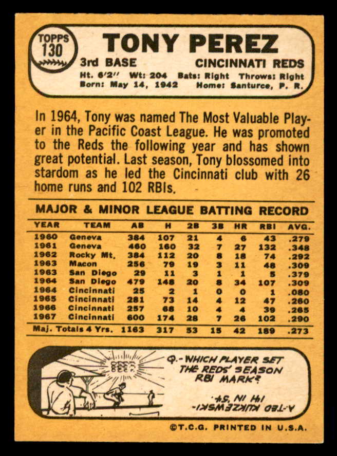 1968 Topps Baseball #130 Tony Perez Reds EX-MT 541027