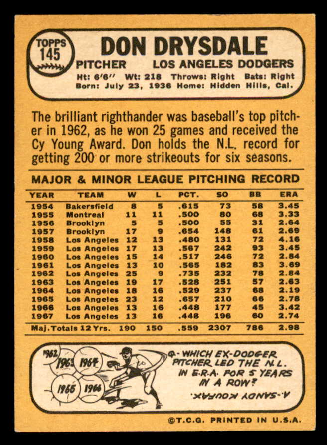 1968 Topps Baseball #145 Don Drysdale Dodgers EX-MT 544639