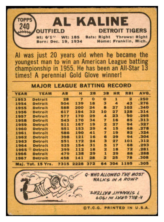 1968 Topps Baseball #240 Al Kaline Tigers VG-EX 531751