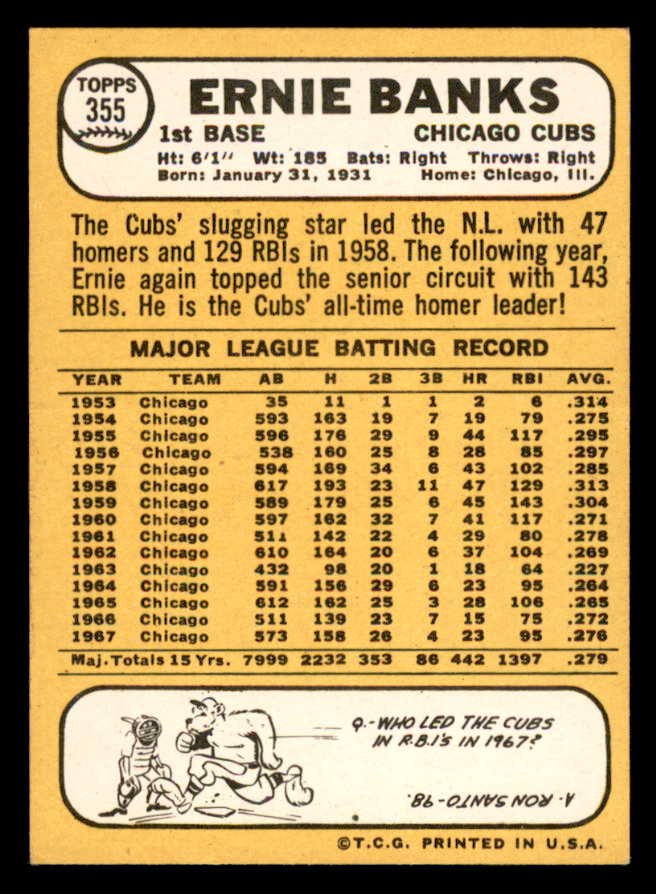 1968 Topps Baseball #355 Ernie Banks Cubs EX-MT 544638