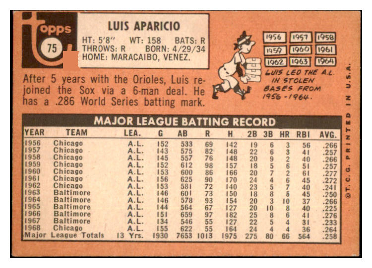 1969 Topps Baseball #075 Luis Aparicio White Sox VG-EX 531773
