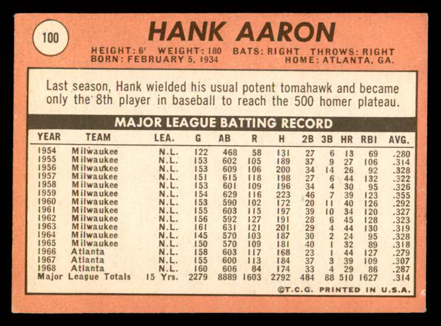 1969 Topps Baseball #100 Hank Aaron Braves EX 539293