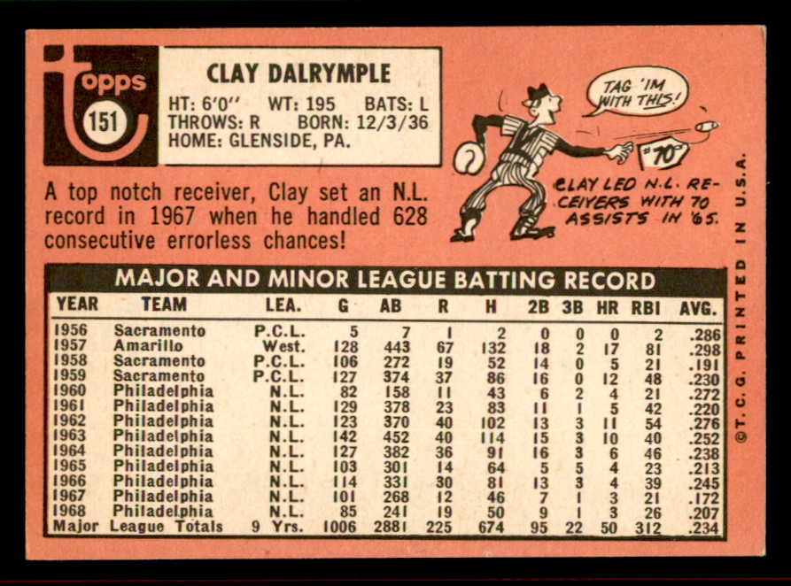 1969 Topps Baseball #151 Clay Dalrymple Phillies EX-MT Variation 542082
