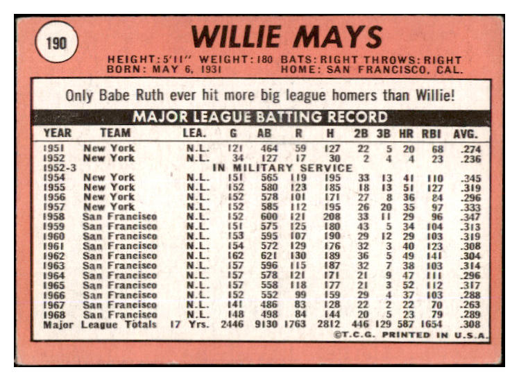 1969 Topps Baseball #190 Willie Mays Giants VG-EX 530481
