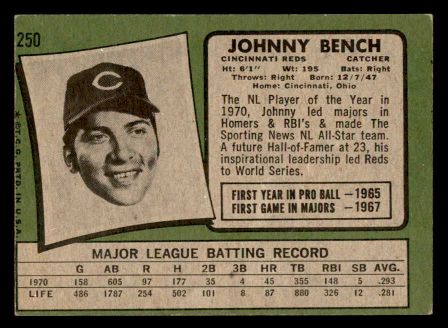 1971 Topps Baseball #250 Johnny Bench Reds EX 538984