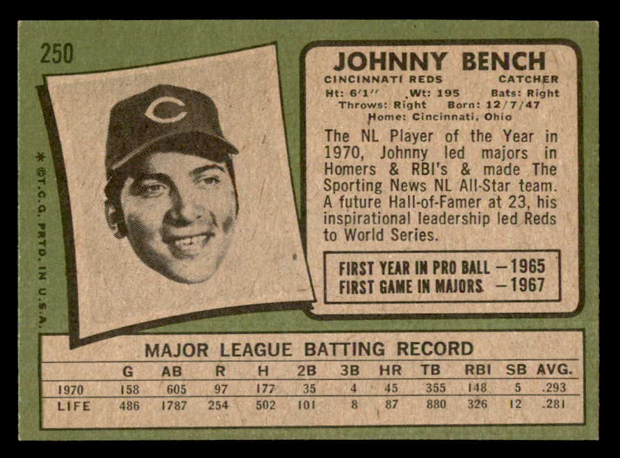 1971 Topps Baseball #250 Johnny Bench Reds EX-MT 538986
