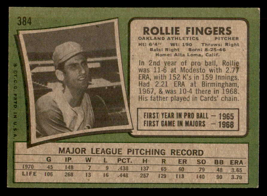 1971 Topps Baseball #384 Rollie Fingers A's EX 541694
