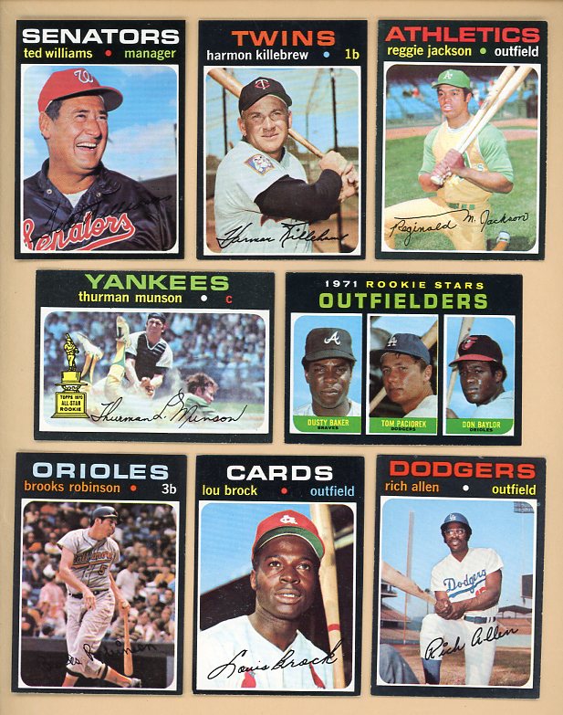 1971 Topps Baseball complete set in EX+/EX-MT condition overall (some better/less). Includes Aaron EX-MT, Ryan EX+/EX-MT, Clemente EX, Mays EX-MT, Banks EX-MT, Bench EX+/EX-MT, Rose EX-MT, Munson EX-MT, Allen EX+/EX-MT, Baker/Baylor rookie EX-MT, Aparicio EX+/EX-MT, Jackson EX-MT, Yastrzemski EX+/EX-MT, Brock EX+/EX-MT, B. Robinson EX-MT, Gibson EX-MT, T. Williams EX-MT, Killebrew EX-MT, etc. Buy with confidence. We are the oldest full-time dealer in America, serving collectors since 1976. ALL CARDS ARE SUBJECT TO YOUR APPROVAL. If you ever receive anything that is unsatisfactory you may return it for replacement or full refund. The card pictured is the actual card you will receive. For orders or assistance, call our Toll Free number 888-548-9686 weekdays 8-6 Pacific.