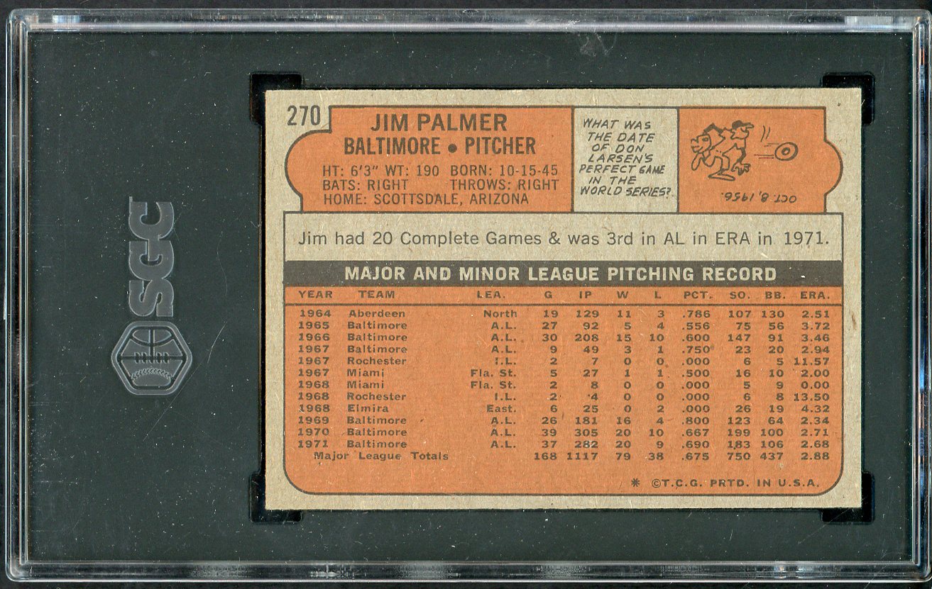 1972 Topps Baseball #270 Jim Palmer Orioles SGC 7 NM 544787