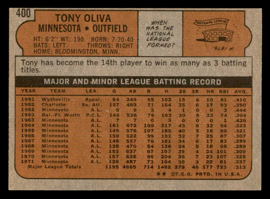1972 Topps Baseball #400 Tony Oliva Twins EX-MT 544672