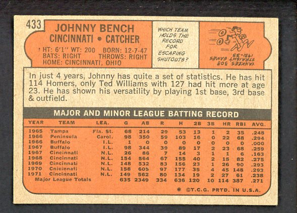 1972 Topps Baseball #433 Johnny Bench Reds VG-EX 542206
