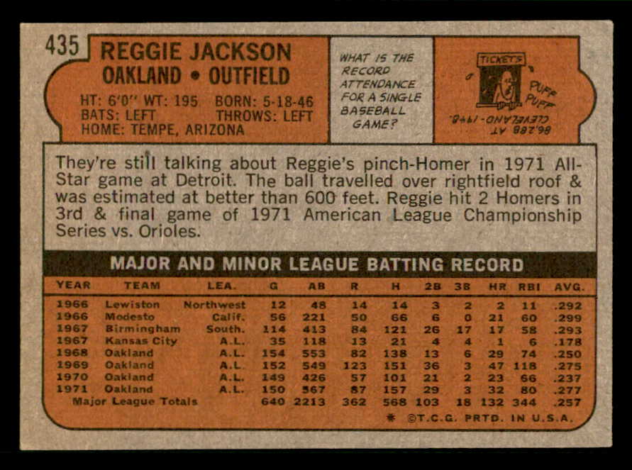 1972 Topps Baseball #435 Reggie Jackson A's EX+/EX-MT 541779