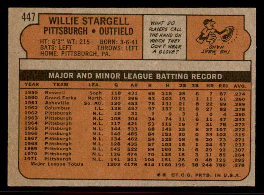 1972 Topps Baseball #447 Willie Stargell Pirates VG-EX 542190
