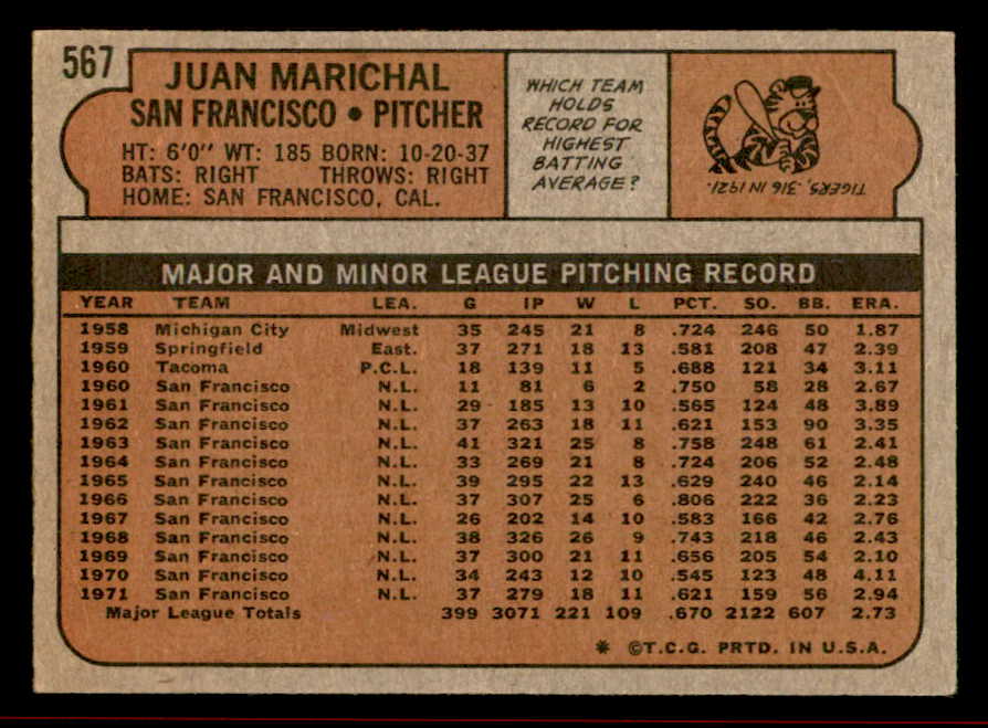 1972 Topps Baseball #567 Juan Marichal Giants EX 542140