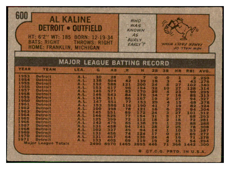 1972 Topps Baseball #600 Al Kaline Tigers EX 537454