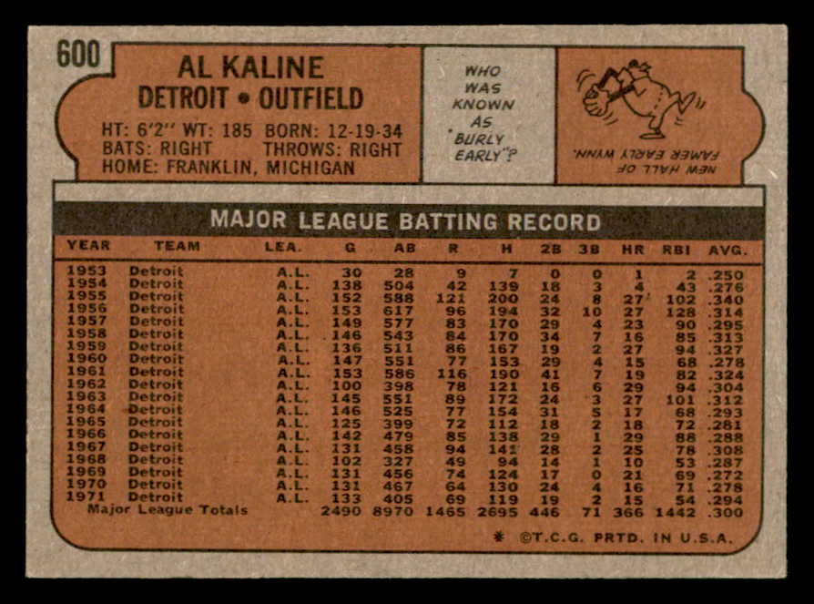 1972 Topps Baseball #600 Al Kaline Tigers EX+/EX-MT 541769