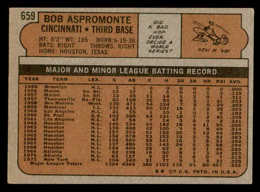 1972 Topps Baseball #659 Bob Aspromonte Reds VG-EX 543154