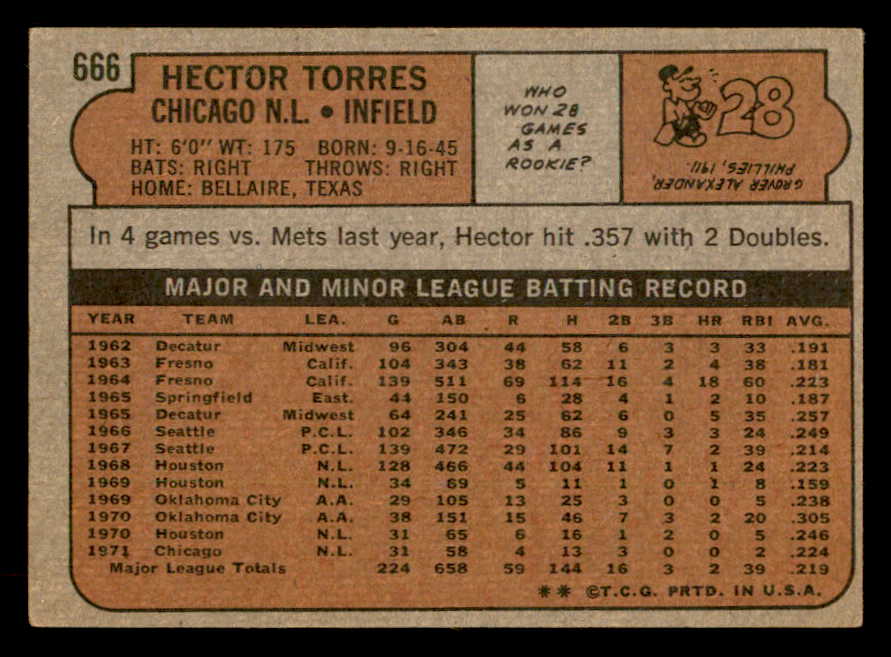 1972 Topps Baseball #666 Hector Torres Cubs VG 543183
