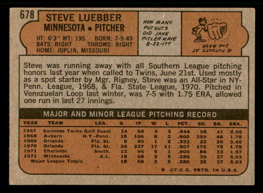 1972 Topps Baseball #678 Steve Luebber Twins VG-EX 543160