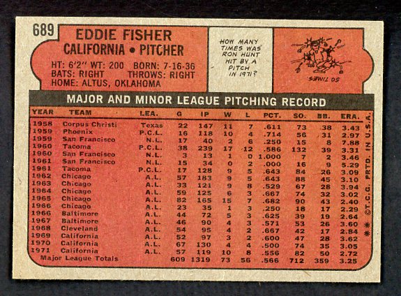 1972 Topps Baseball #689 Eddie Fisher Angels EX-MT 543141