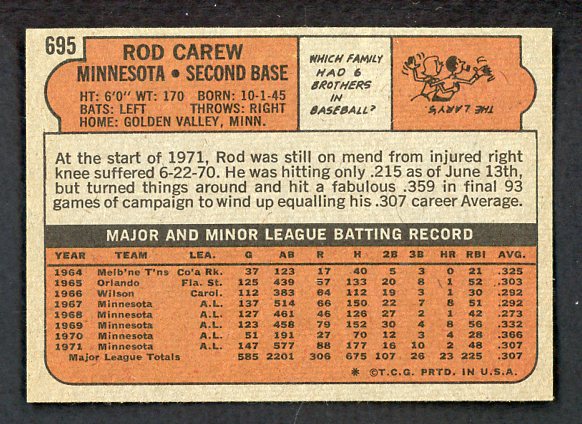1972 Topps Baseball #695 Rod Carew Twins EX-MT 542122