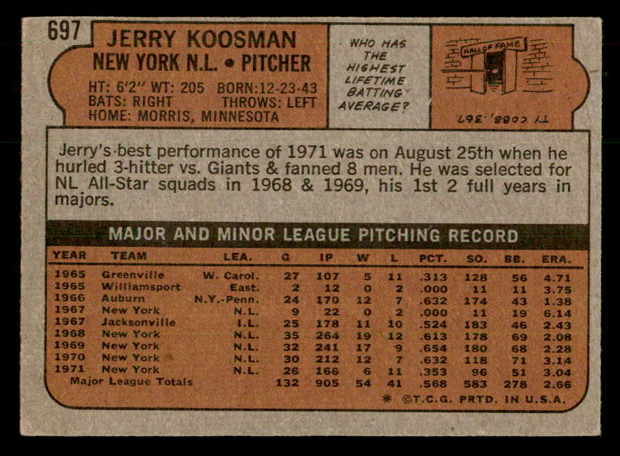 1972 Topps Baseball #697 Jerry Koosman Mets VG-EX 541486