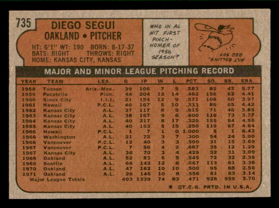 1972 Topps Baseball #735 Diego Segui A's NR-MT 543112
