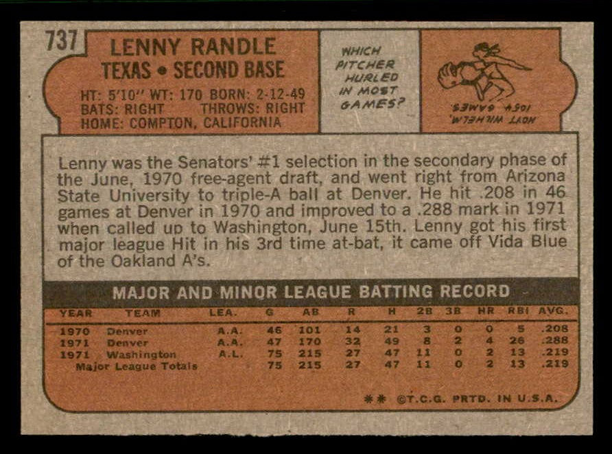 1972 Topps Baseball #737 Lenny Randle Rangers NR-MT 543113