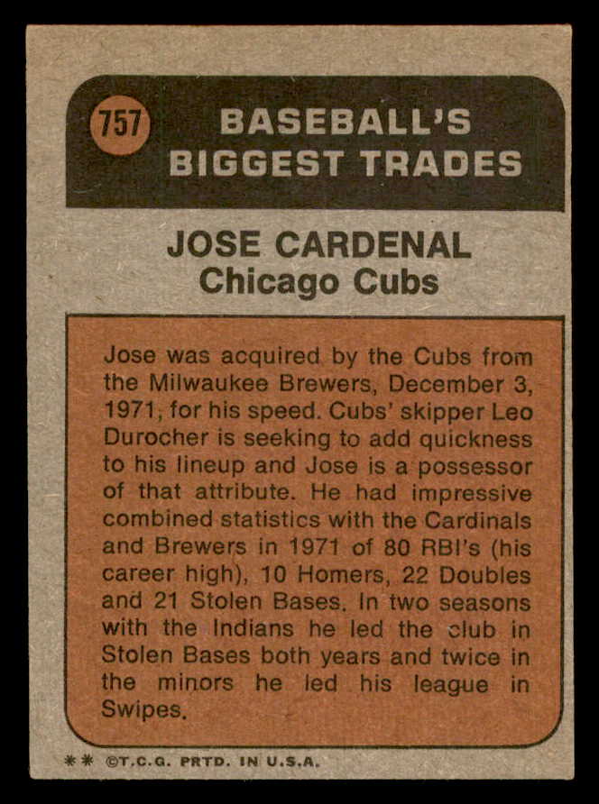 1972 Topps Baseball #757 Jose Cardenal TR Cubs VG-EX 543175