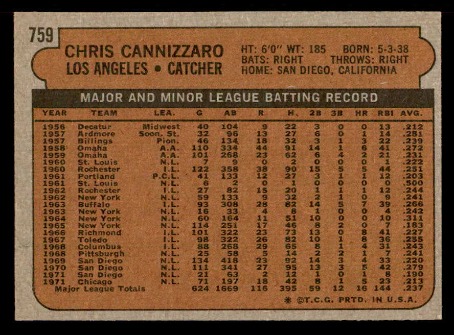 1972 Topps Baseball #759 Chris Cannizzaro Dodgers NR-MT 543124