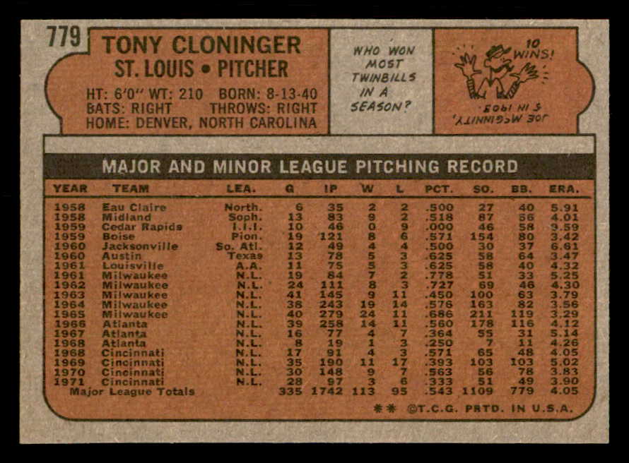1972 Topps Baseball #779 Tony Cloninger Cardinals NR-MT 543130