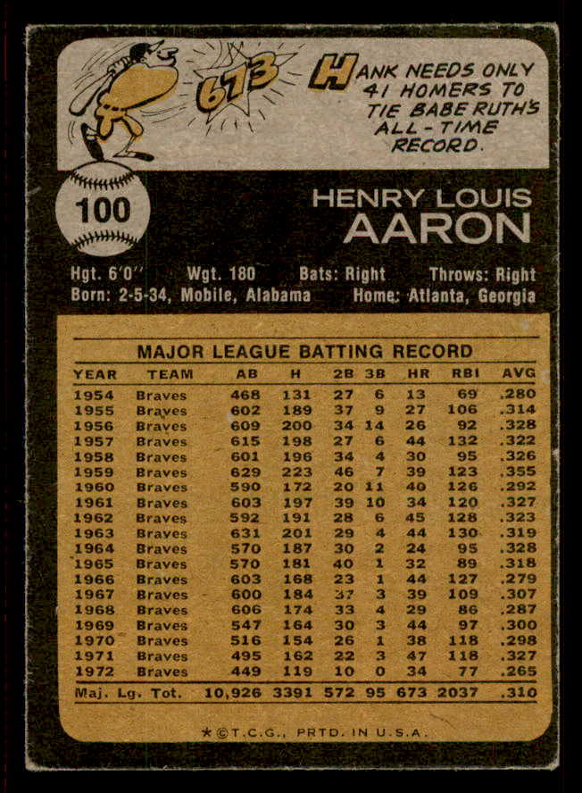 1973 Topps Baseball #100 Hank Aaron Braves EX 542298