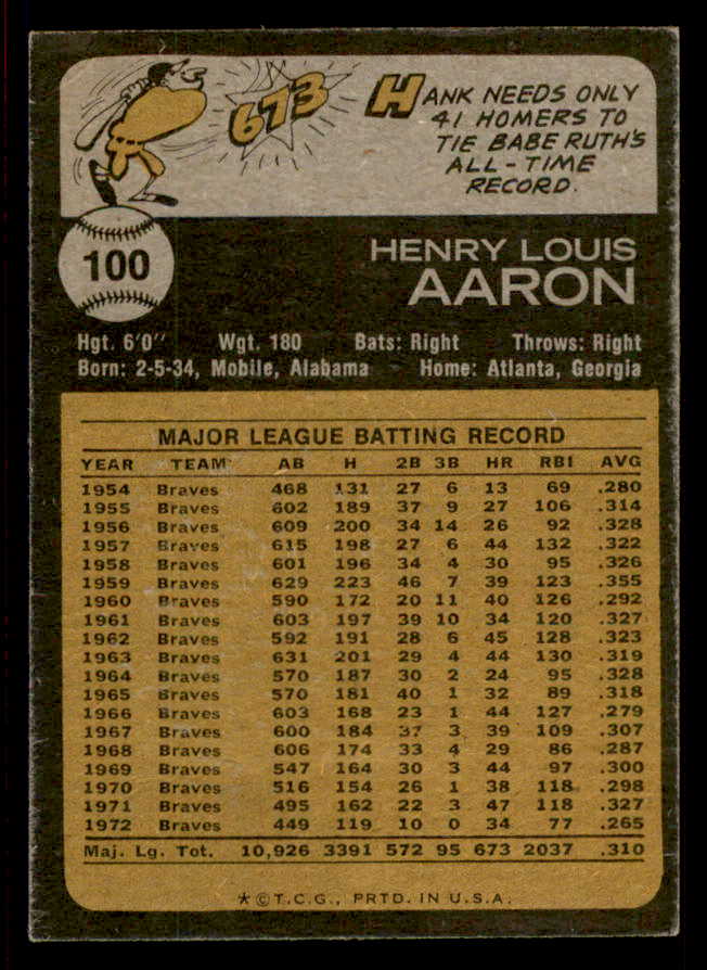 1973 Topps Baseball #100 Hank Aaron Braves VG-EX 542297