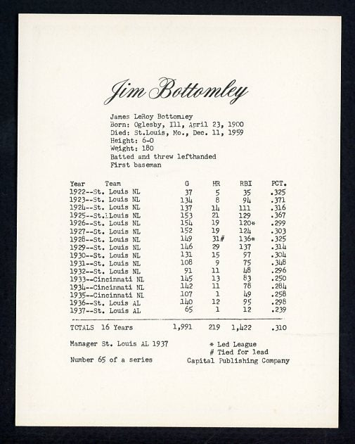 1974 Capital Publishing #065 Jim Bottomley Cardinals NR-MT 537632