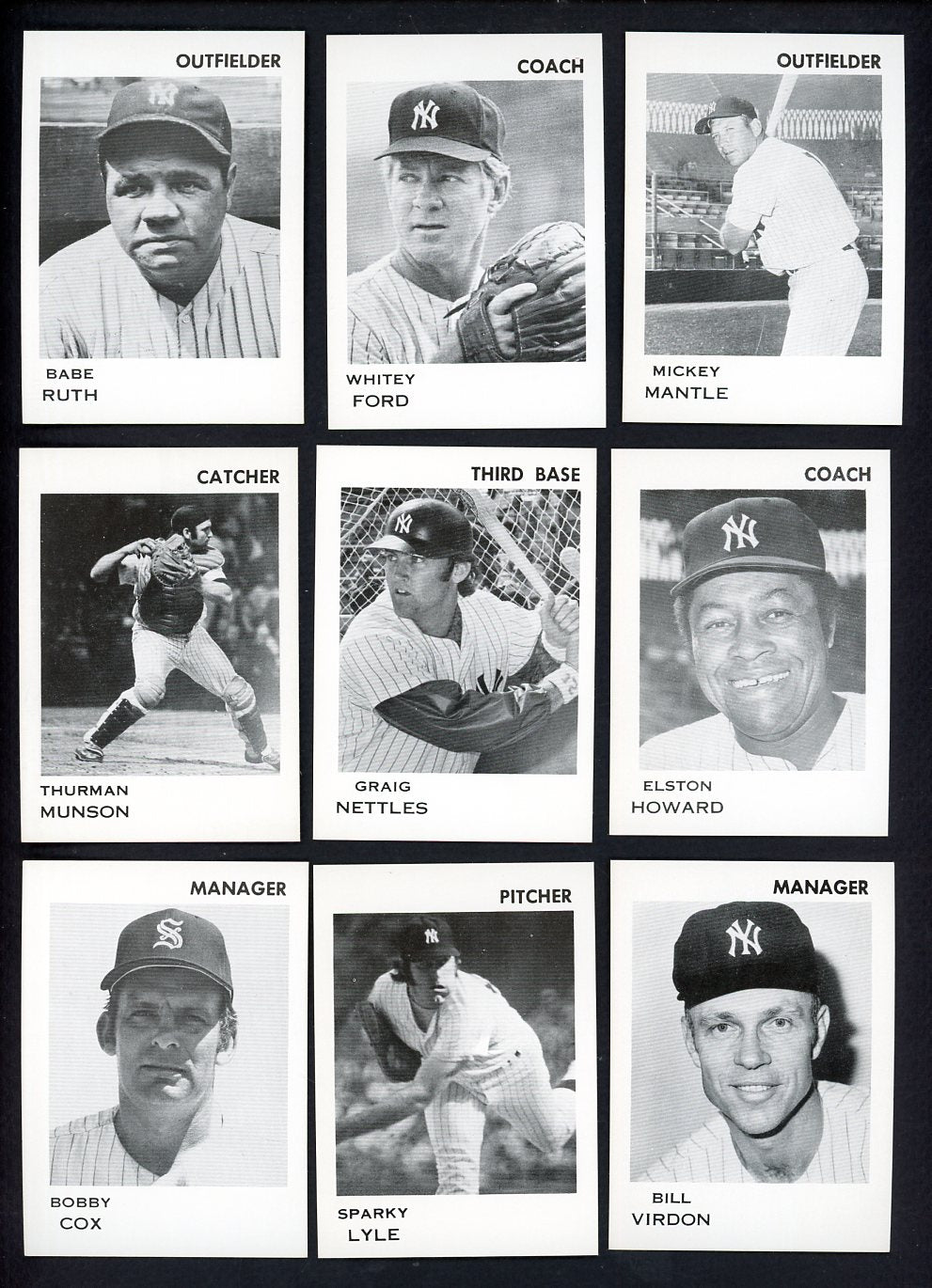 25 card set. Includes Babe Ruth, Thurman Munson, Mickey Mantle, Bobby Cox, Elston Howard, Whitey Ford, etc. Buy with confidence. We are the oldest full-time dealer in America, serving collectors since 1976. ALL CARDS ARE SUBJECT TO YOUR APPROVAL. If you ever receive anything that is unsatisfactory you may return it for replacement or full refund. The card pictured is the actual card you will receive. For orders or assistance, call our Toll Free number 888-548-9686 weekdays 8-6 Pacific.
