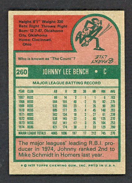 1975 Topps Baseball #260 Johnny Bench Reds EX 542077