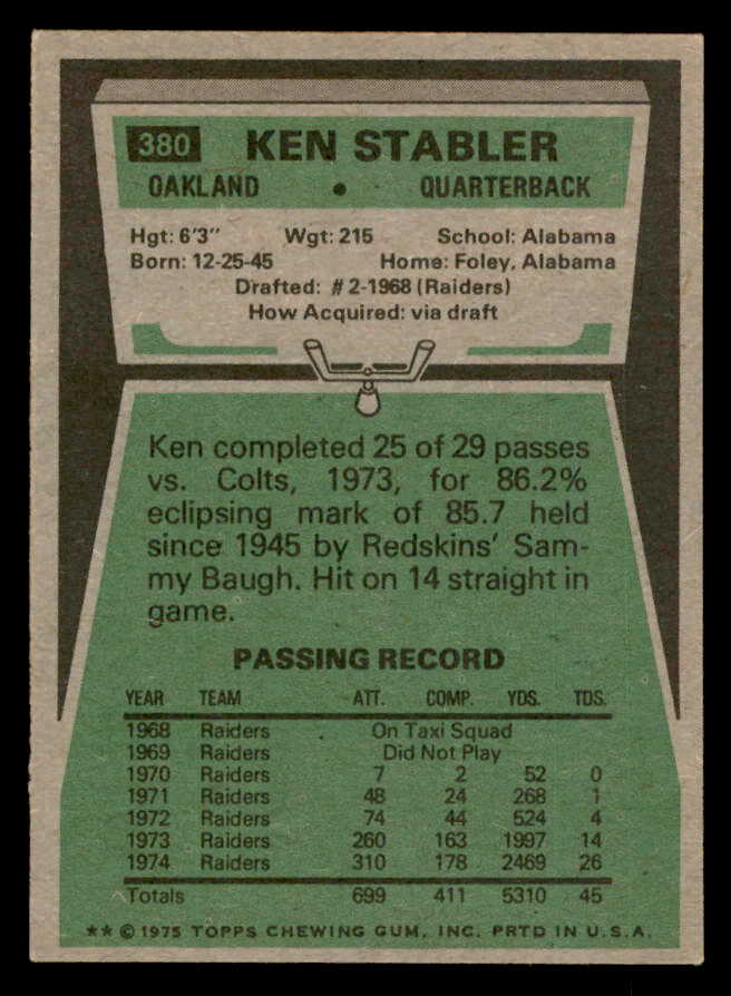 1975 Topps Football #380 Ken Stabler Raiders EX+/EX-MT 547134