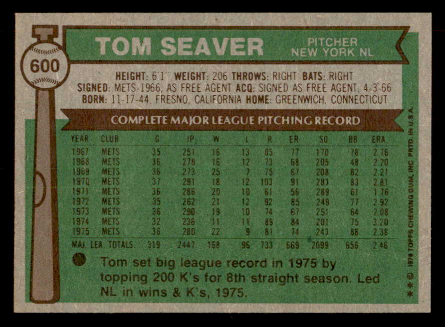 1976 Topps Baseball #600 Tom Seaver Mets EX-MT 541595