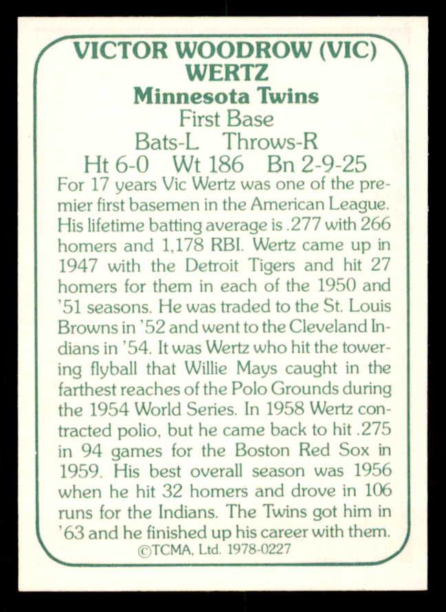 1978 TCMA #227 Vic Wertz Twins Signed Autographed