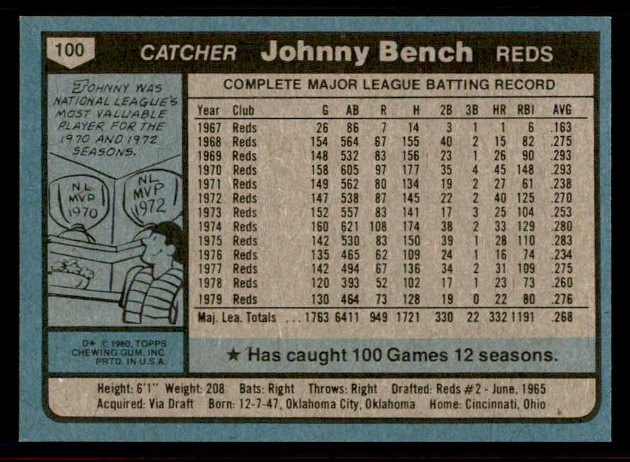 1980 Topps Baseball #100 Johnny Bench Reds EX-MT 542219