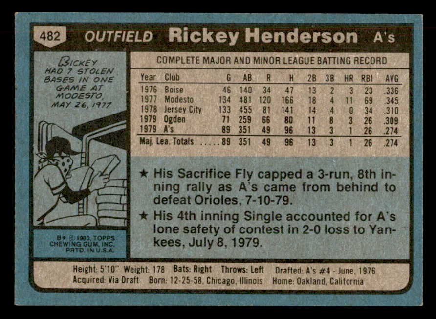 1980 Topps Baseball #482 Rickey Henderson A's EX-MT 541641