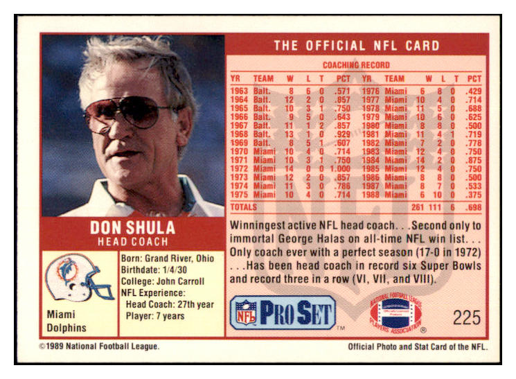1989 Pro Set #225 Don Shula Dolphins Signed Autographed 532033