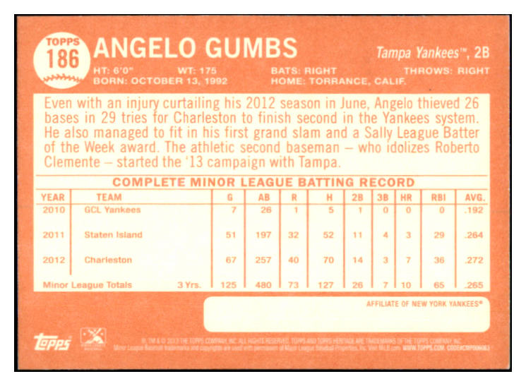 2013 Topps Heritage #186 Angelo Gumbs Yankees Signed Autographed 531885